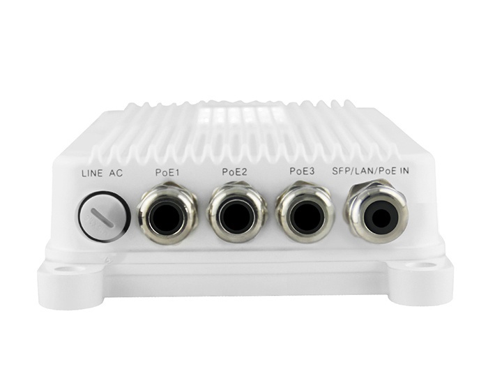 After negotiating IEEE802.3at standard PD, the three PoE output ports delivers 55Vdc, 0.55A up to 30W power with 6KV surge protection for remote PDs over 2 Pair at 1000Mbps data rates. It works with a wide input voltage of 100-240Vac with 6KV surge protection and operates under -40℃ to +65℃. It fully complies with 802.3at and remains compatible with any IEEE802.3af compliant devices, such as IP Cameras, wireless APs, Microwave radio, IoT application and other high power PoE devices.